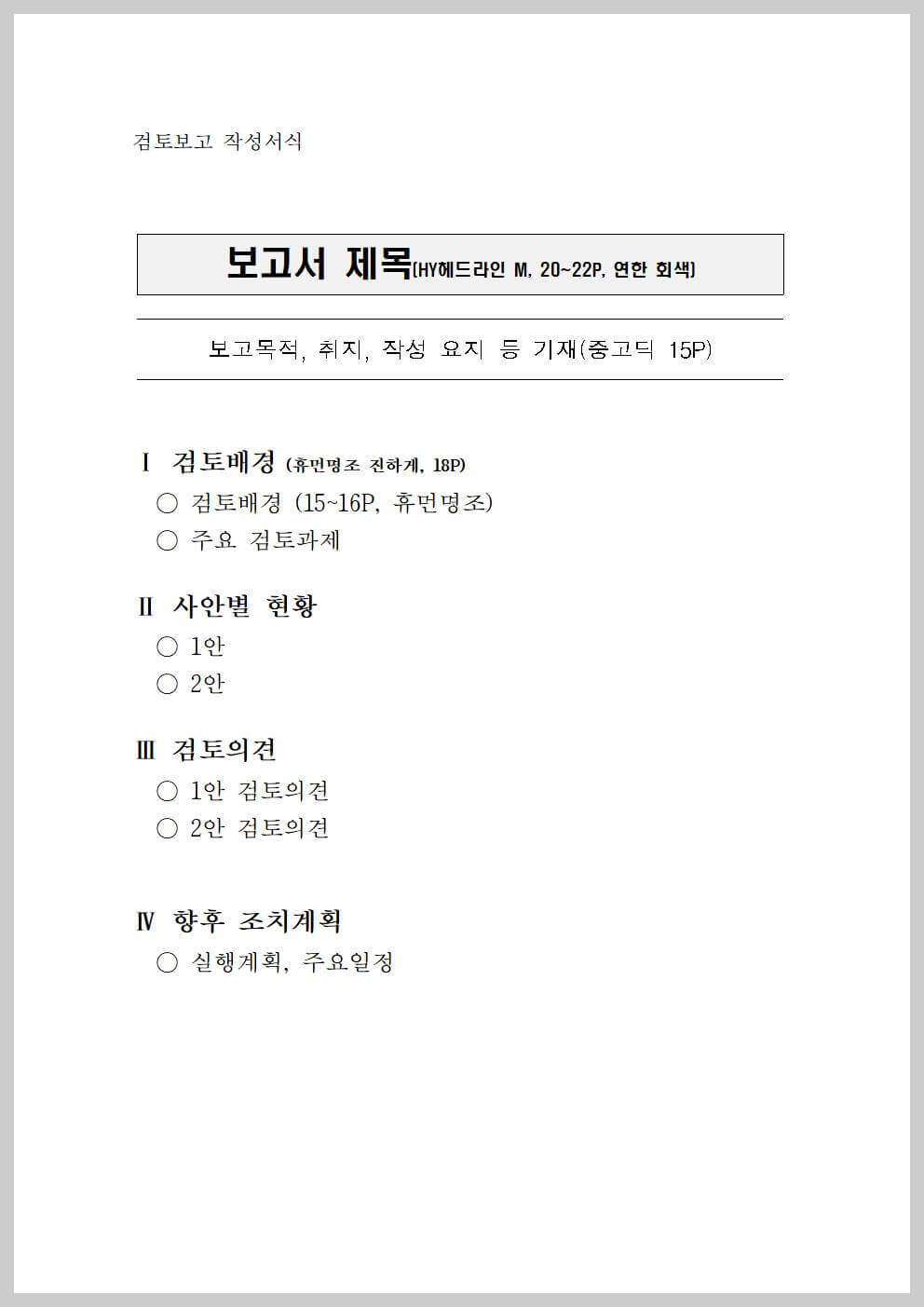 작성기관별 사용하는 서식이 모두 다르기 때문에 자체 보고를 위한 표준서식을 참고하여 작성하는 것이 좋습니다. 표지의 제목, 작성일자, 쪽수, 글씨체, 크기 등 본문의 표준 규격을 적용하고 보고서가 한눈에 들어올 수 있도록 체계적으로 내용을 전개하기 바랍니다.