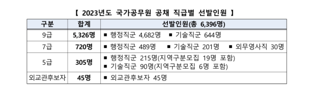 인사혁신처에서는 2023년 공무원 채용규모를 최근 5개년간의(18 ~ 22년) 평균인 약 6,395명과 비슷한 수준으로 결정하고 22년 퇴직 인원과 부족한 행정 서비스 수요 등을 종합적으로 고려하여 최종 인원 6,396명이 결정되었습니다. 직렬별 세부 인원은 5급 공채인원 305명, 7급 공채인원 720명, 9급 공채인원 5,326명 입니다.