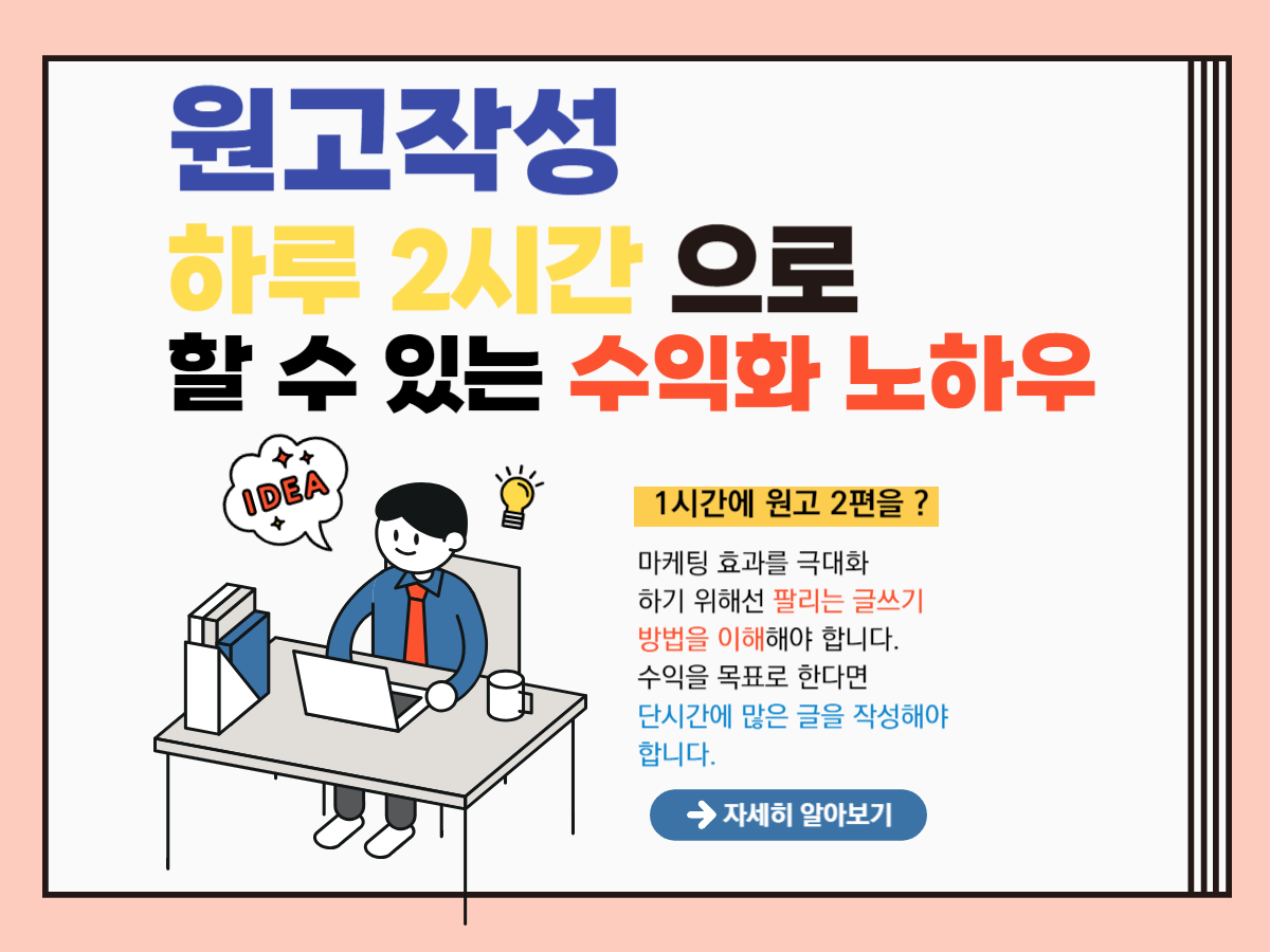 ** 원고 알바의 경우 작성하는데 다양한 노하우가 필요한 과정으로 1시간안에 2편 이상의 글을 작성하기 위해서는 기본적인 로직과 글쓰기 방법을 이해해야 합니다. 이 부분을 이해하고 나면 하루 2시간 정도 투자하여 140만원의 추가 소득을 확보할 수 있습니다.