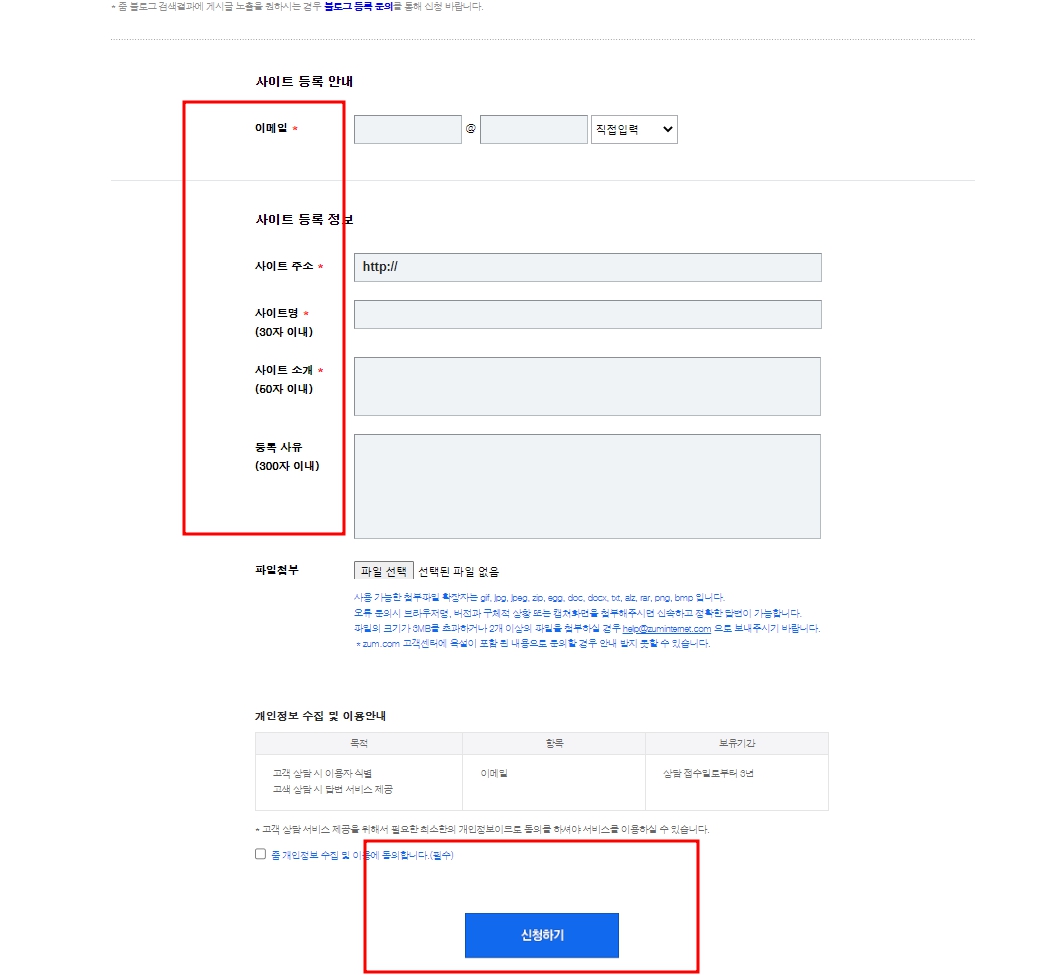 ○ 줌(zum) 사이트 검색등록 - 사이트 신청서 작성