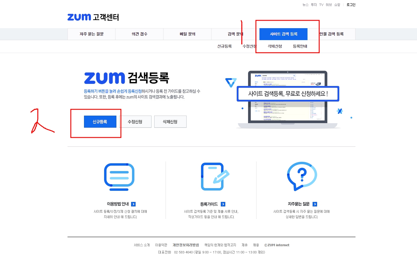 ○ 줌(zum) 사이트 검색등록 - 신규등록 클릭