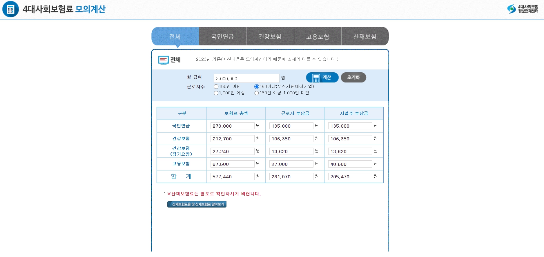 4대보험 부과 금액은 4대보험 정보연계센터 홈페이지를 통해 간단하게 계산해 볼 수 있습니다. 300만원 급여자의 4대보험을 계산해 보면 다음과 같습니다.
